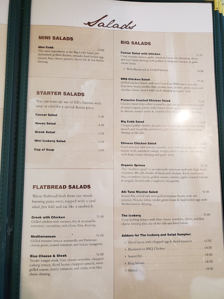 Feta cheese, olives, cucumbers, tomatoes, onions. Various dressings available including Italian, Ranch, Blue Cheese, Caesar, and more. Dressing options also include extra or on the side.